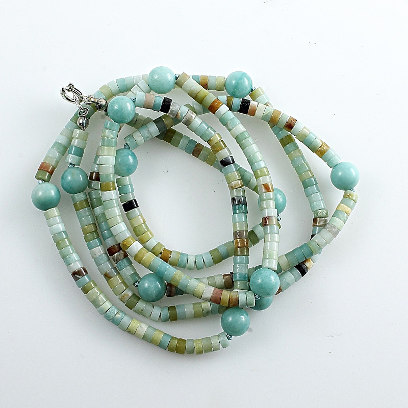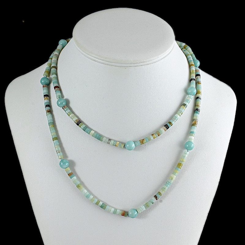 Amazonit pici nyers roundelle (4,5x2,3mm) kígyó lánc között random közönként 8mm golyók (12db) - extra hosszú nyaklánc (98cm) - hordható 2 sorosként is !! rugós zárral ellátva.