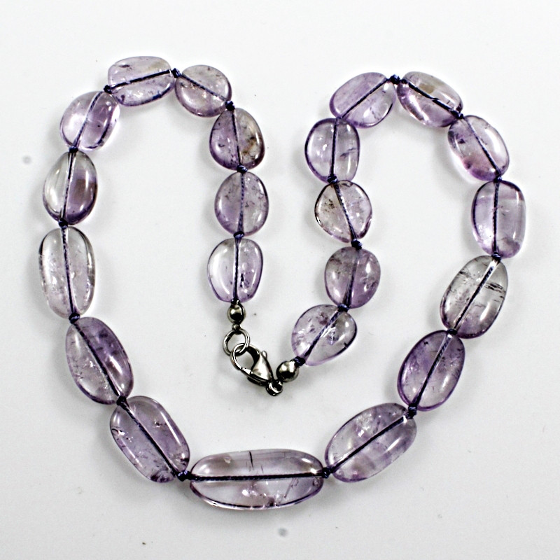 Selymes, halványlila, ovál-amorf középre növekvő (verlauf) egyedi kavicsokból, "natural silk" csomózott nyl, karabiner, 48cm