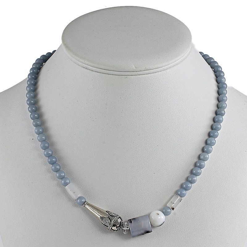 Angelit golyók nyaklánc dendrites acháttal, hegyi kristállyal és merlinittel. A dísz ből készült, a zár mágneses, ródiumozott.