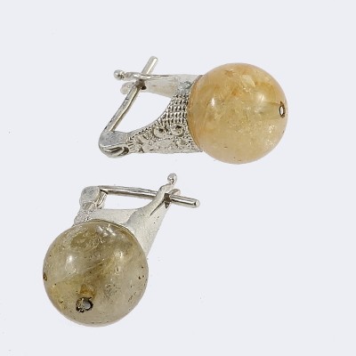 Keleti díszítésű foglalatban 10 mm átmérőjű citrin golyó ül - a zárószerkezet „sorompós”.  Nem bedugós de nem is lógós, mert fixen ül a fülcimpa alatt a kő.
