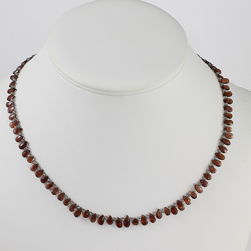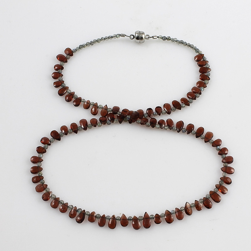 Fazettált gránát cseppek között pici labradorit golyók. A nyaklánc mágneszárral készült