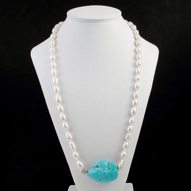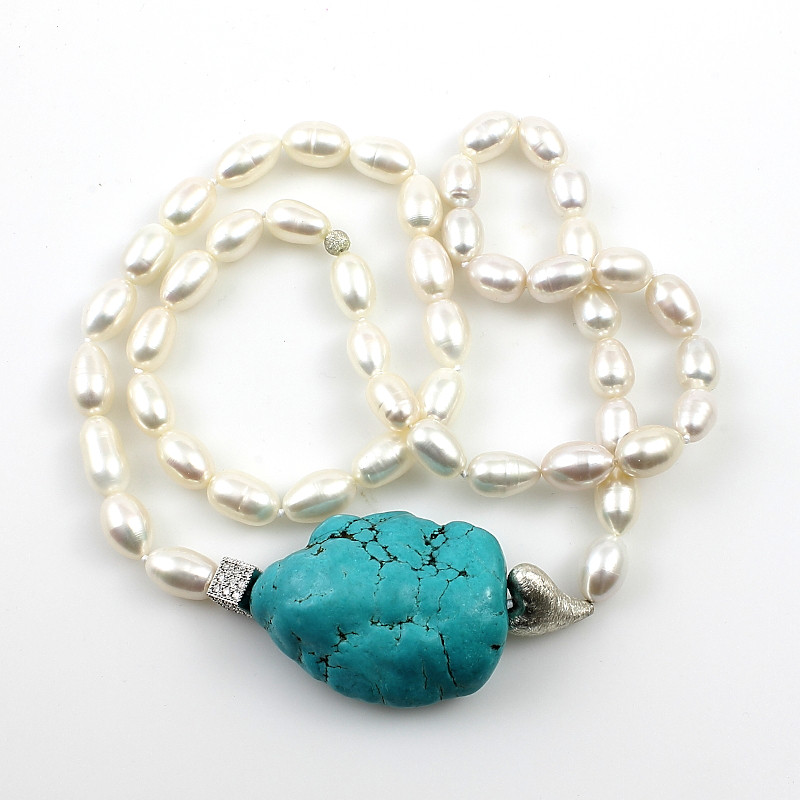 Prémium minőségű édesvízi tenyésztett gyöngysor egy óriás színezett magnezit medállal és díszekkel.