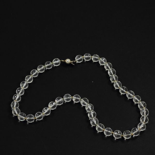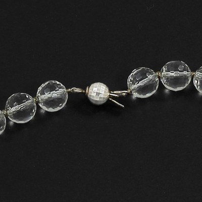 Csiszolt hegyikristály 1cm átmérőjű golyók, közöttük a díszek és a nyaklánc zárja ből