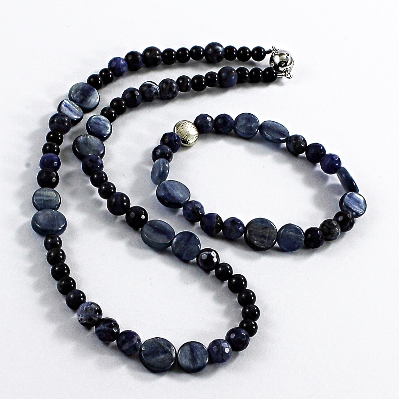 Kianit korongokból és szodalit fazettált golyókból nyaklánc és karkötő. A karkötő gumis egy ezüstözött fém közdarabbal.