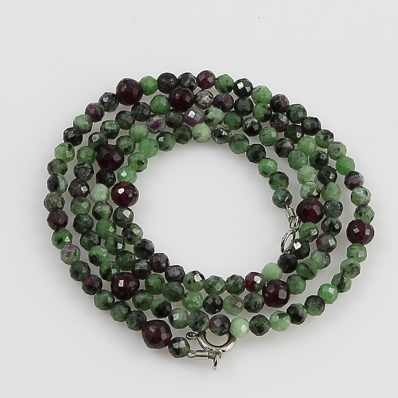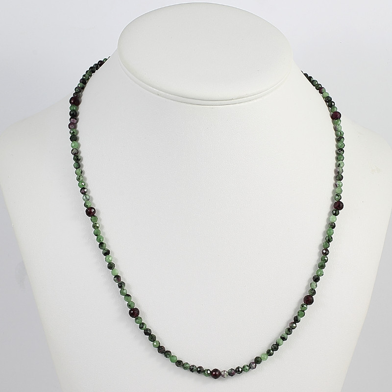 Hosszú nyaklánc: pici, fazettált nefrit rubinnal golyók néhány gránttal keverten, ródiumozott zárral.