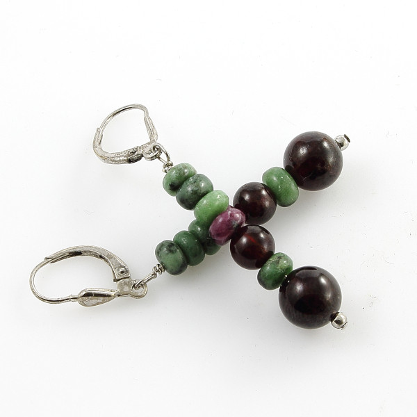 Patent fülbevaló roundelle formájú nefrit rubin kövekből és gránátokból ródiumozott beakasztóval. ( A nefrit rubin a zoizit speciális megjelenése)